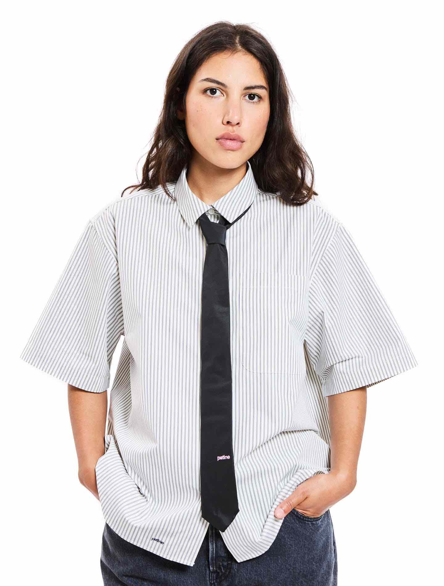 La chemisette mode et structurée à l'inspiration nerd. À reporter avec tout sortie ou rentrée, ouverte, fermée, boutonnée ou décolletée, nouée devant ou derrière, manches roulées, déroulées, reroulées ... addictives. Taillée dans la sublime toile italienne Poppy. Une matière dense sans être raide qui sait se tenir (vous aussi ?). La chemise de comptable d'un open space d'une entreprise d'imprimantes du Wisconsin dans les années 80 remixée sauce Patine. Calculatrice en option, on a déjà calculé les émissions carbone.